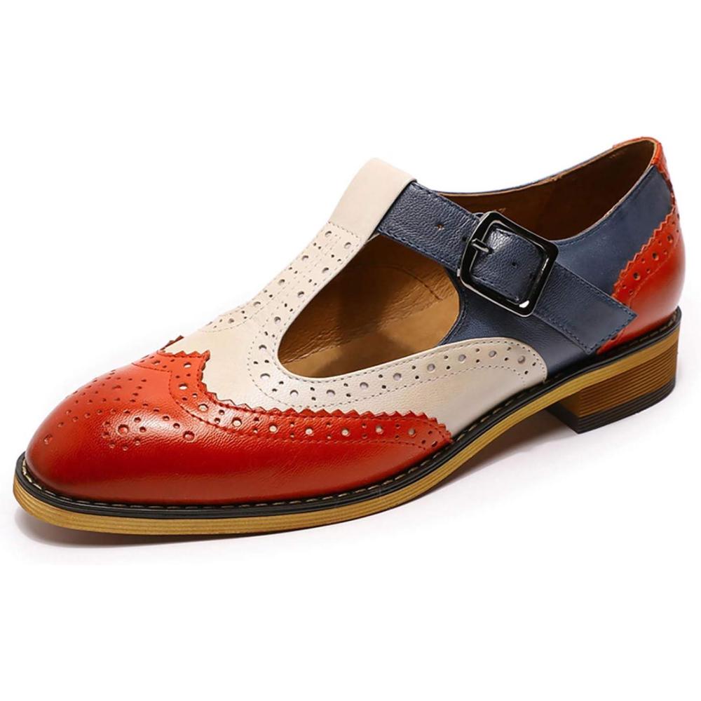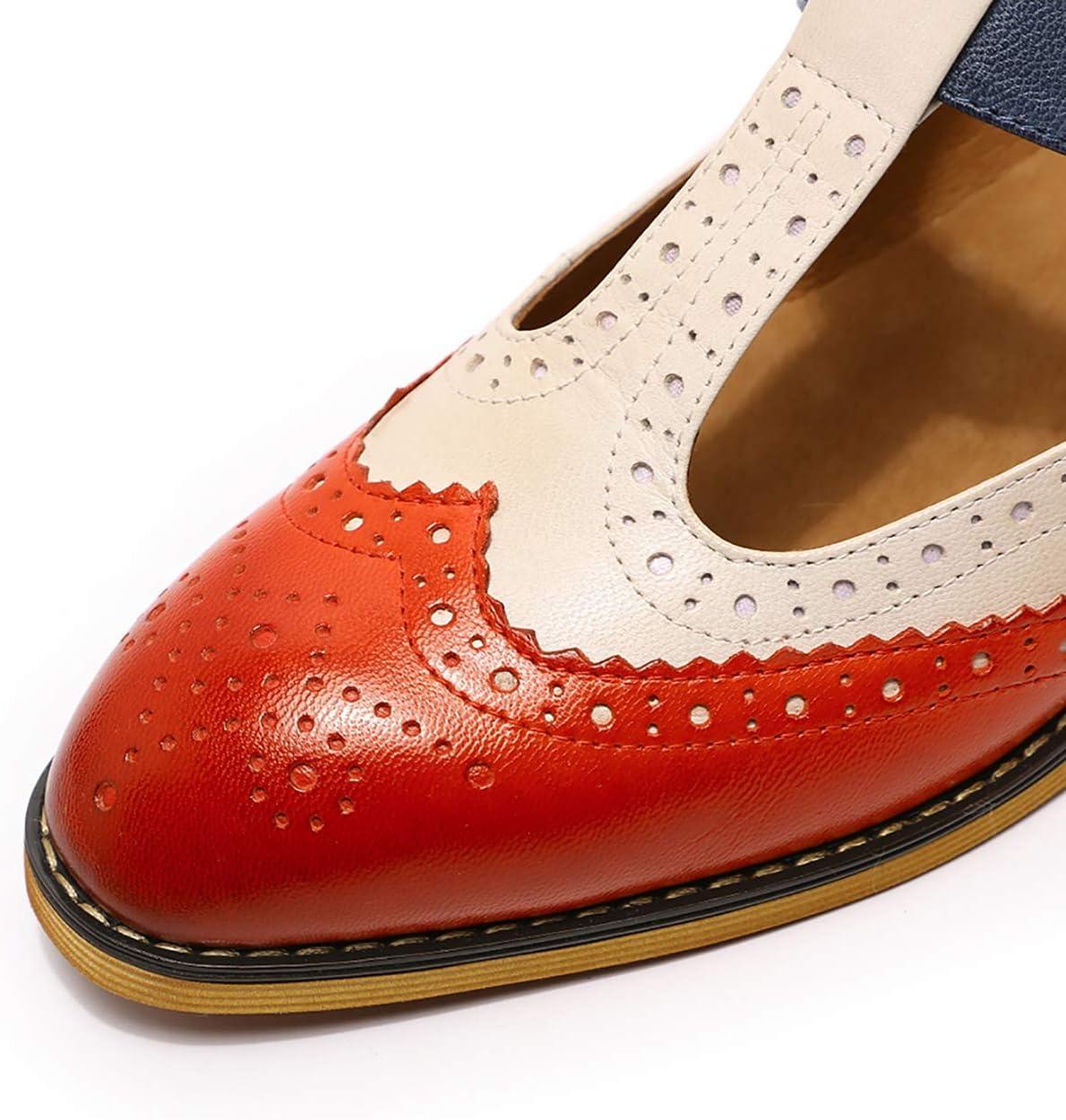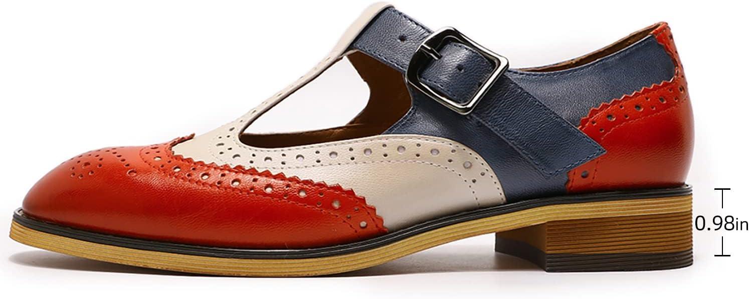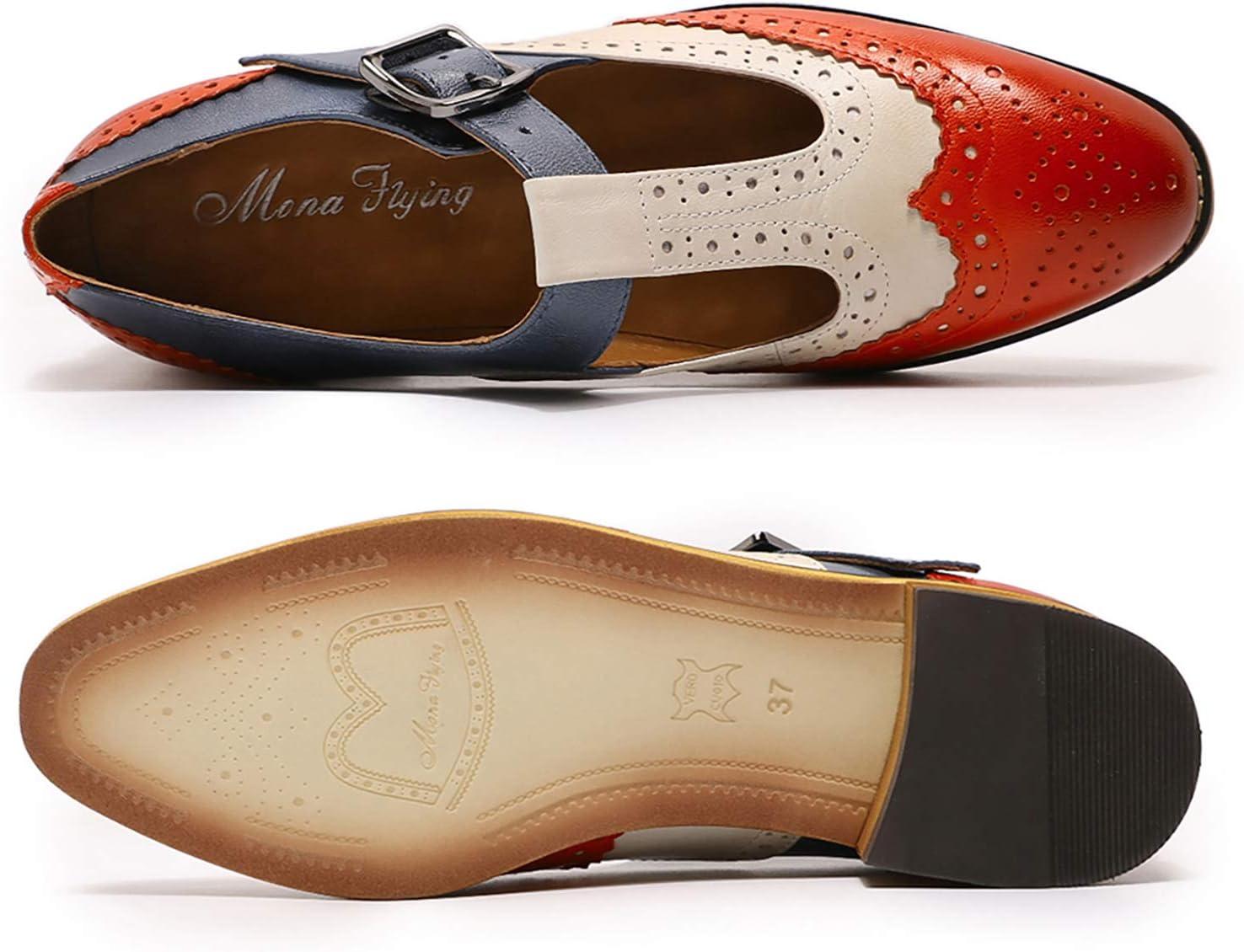 Mona flying Women’s Classic Wingtip Oxfords Mary Jane T Strap Flat Leather Shoes for Ladies(Red-offwhite-blue)