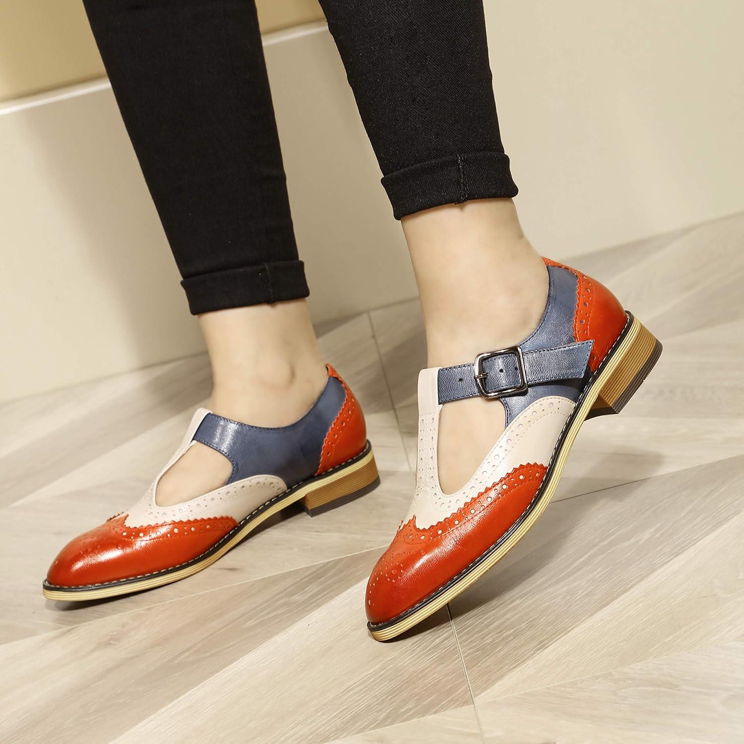 Mona flying Women’s Classic Wingtip Oxfords Mary Jane T Strap Flat Leather Shoes for Ladies(Brown)