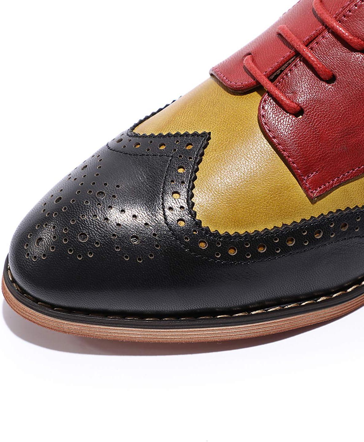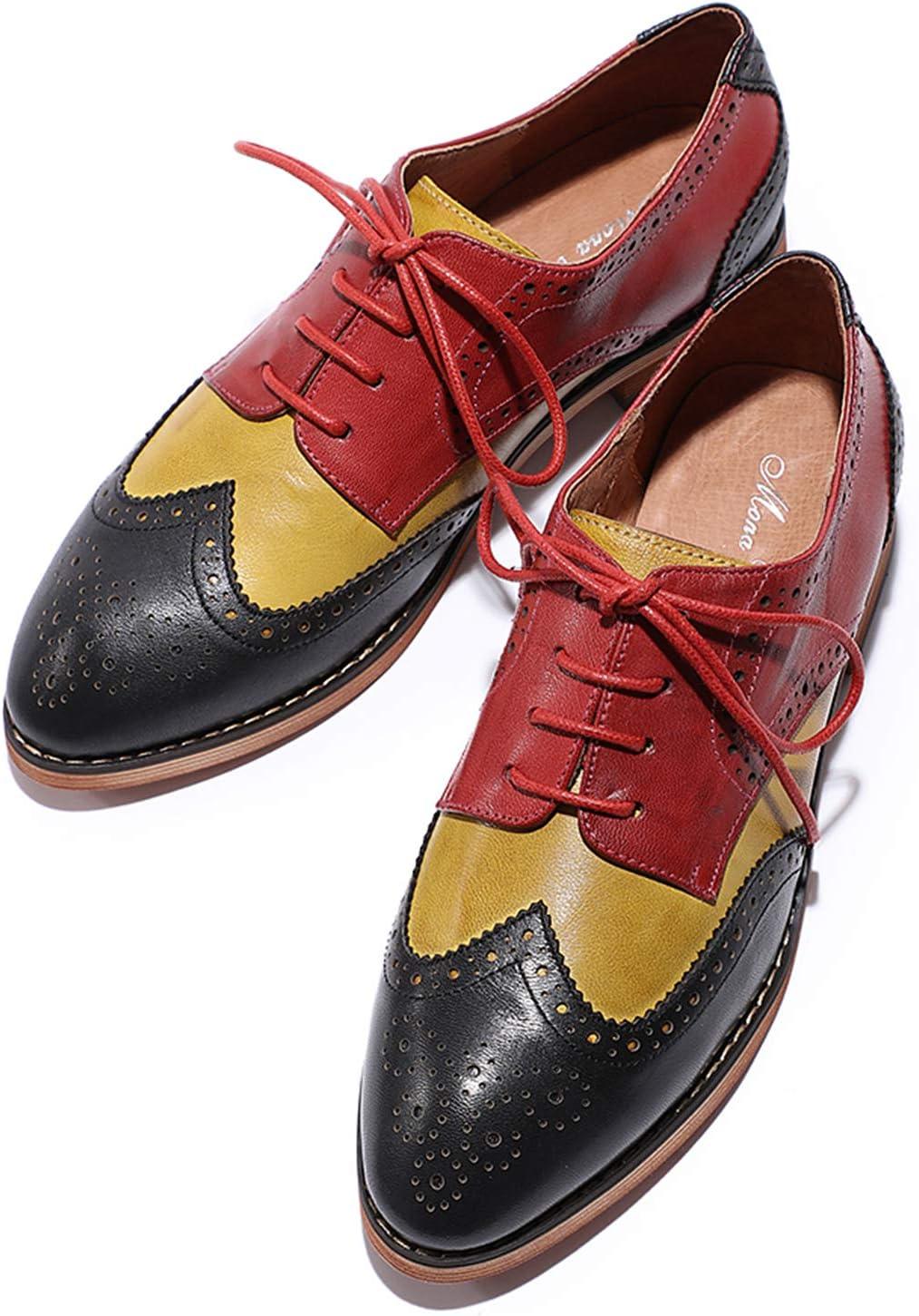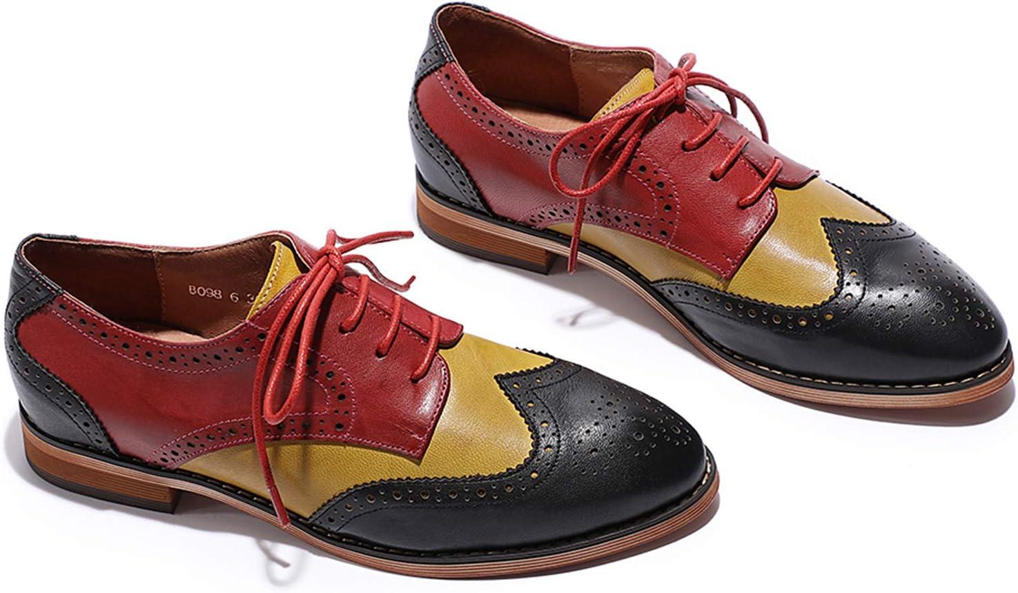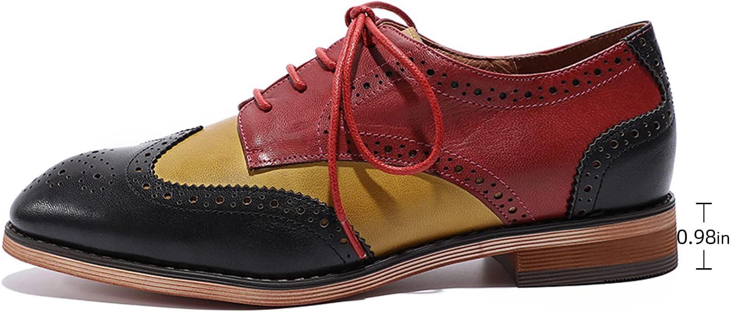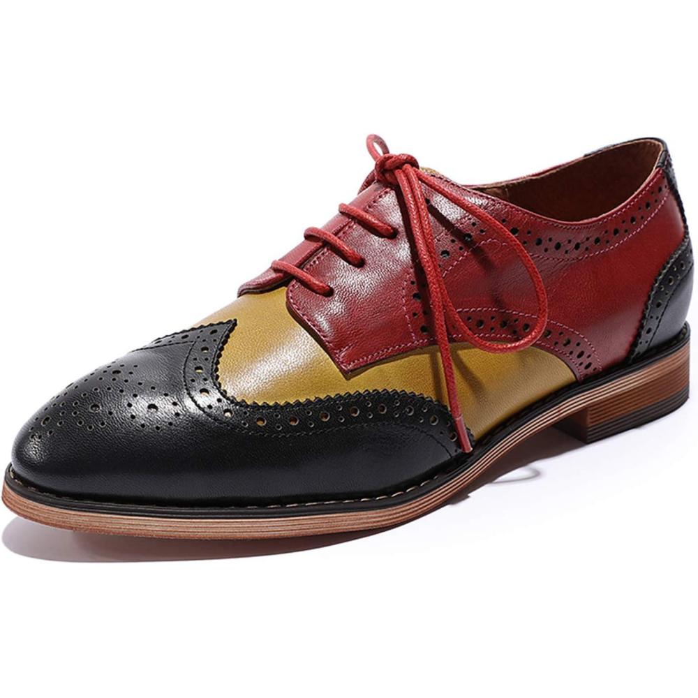 Mona flying Women’s Comfortable Multicolored Wingtip Oxfords Brogue Lace-up Leather Shoes for Womens Ladies(Black-yellow-red)