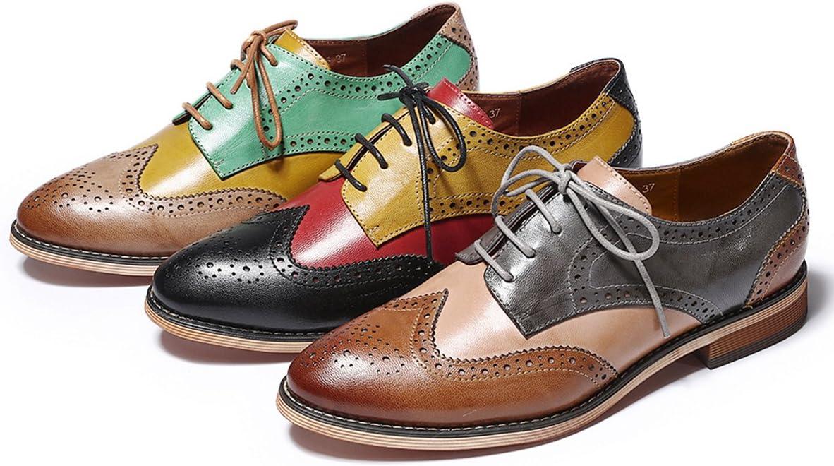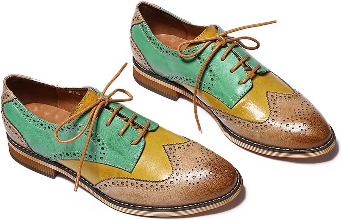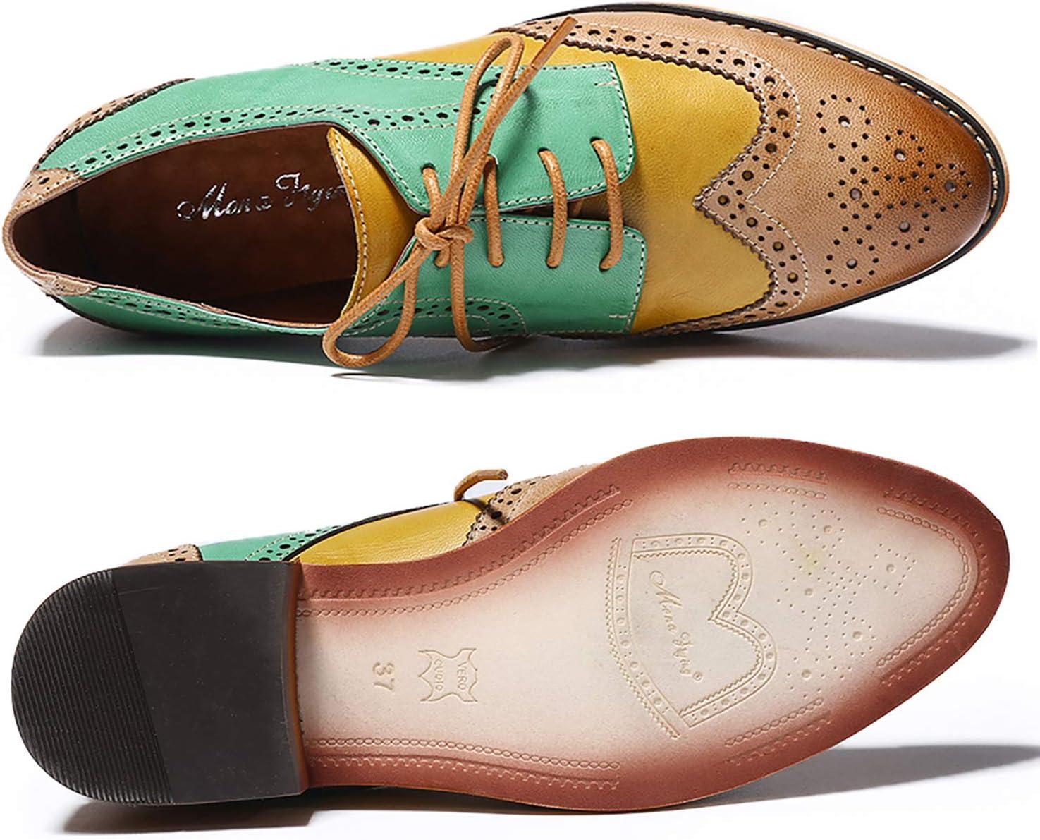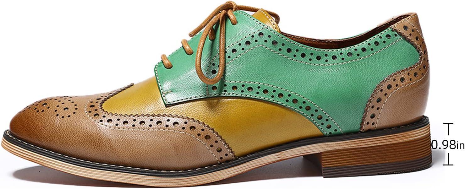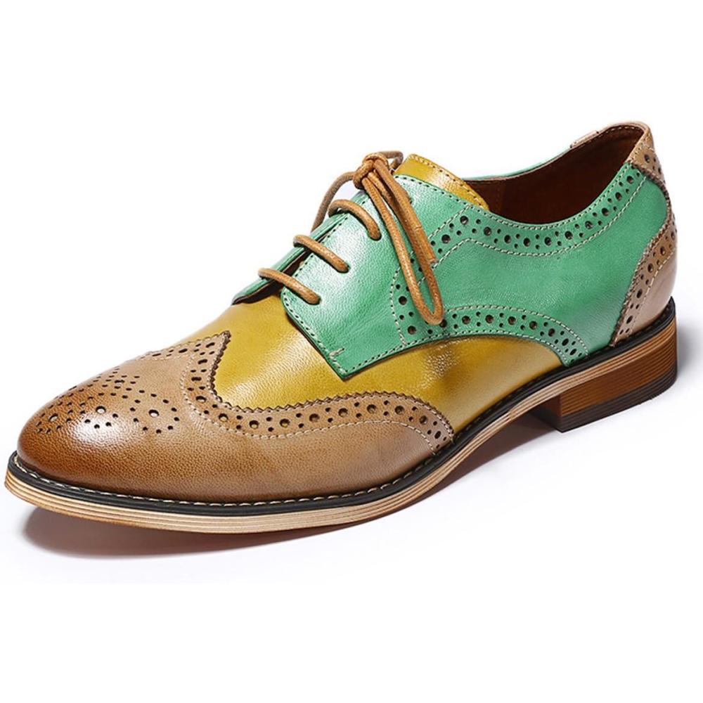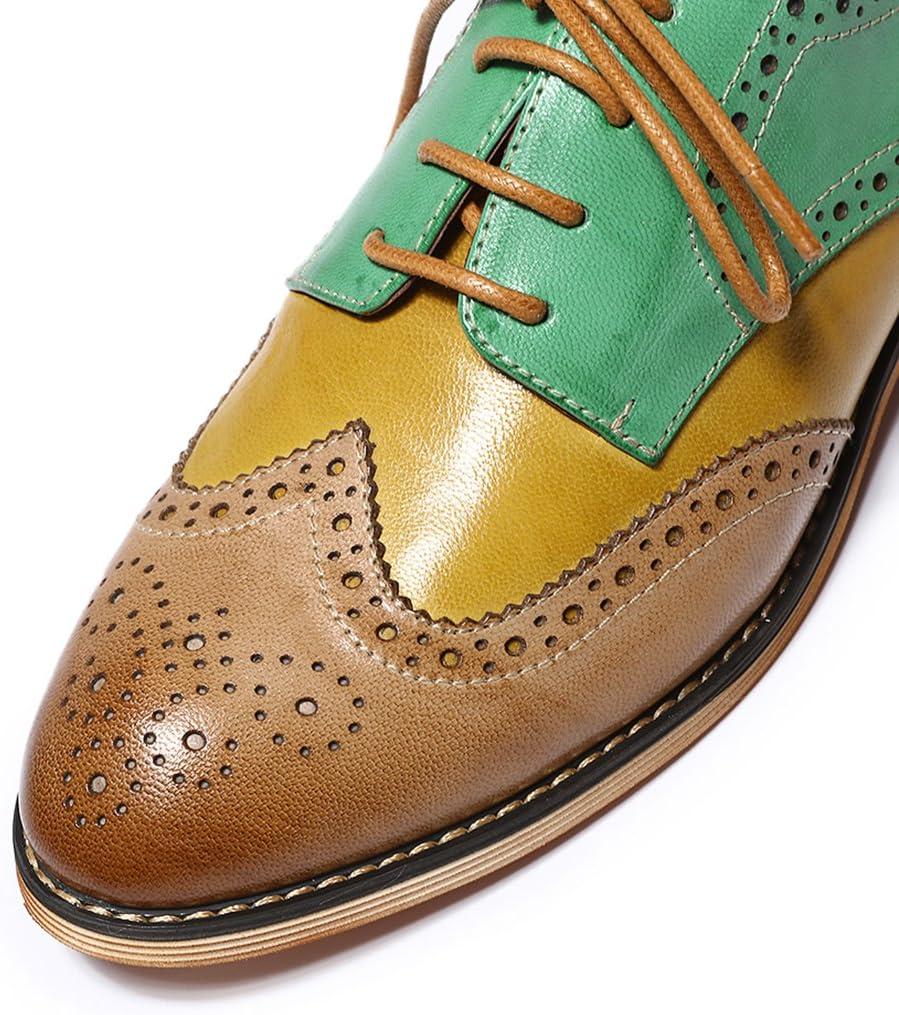 Mona flying Women’s Comfortable Multicolored Wingtip Oxfords Brogue Lace-up Leather Shoes for Womens Ladies(Brown-yellow-green)