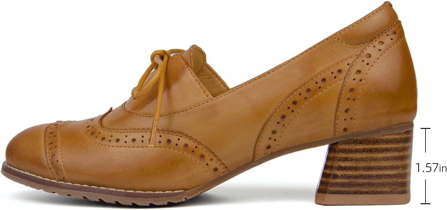Mona flying Womens Leather 4 cm Chunky Heel Wingtip Oxfords Brogue Lace up Dress Pumps for Ladies(Brown)