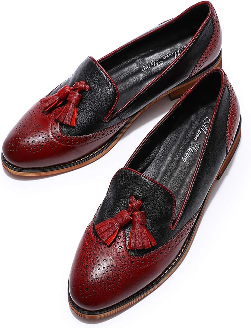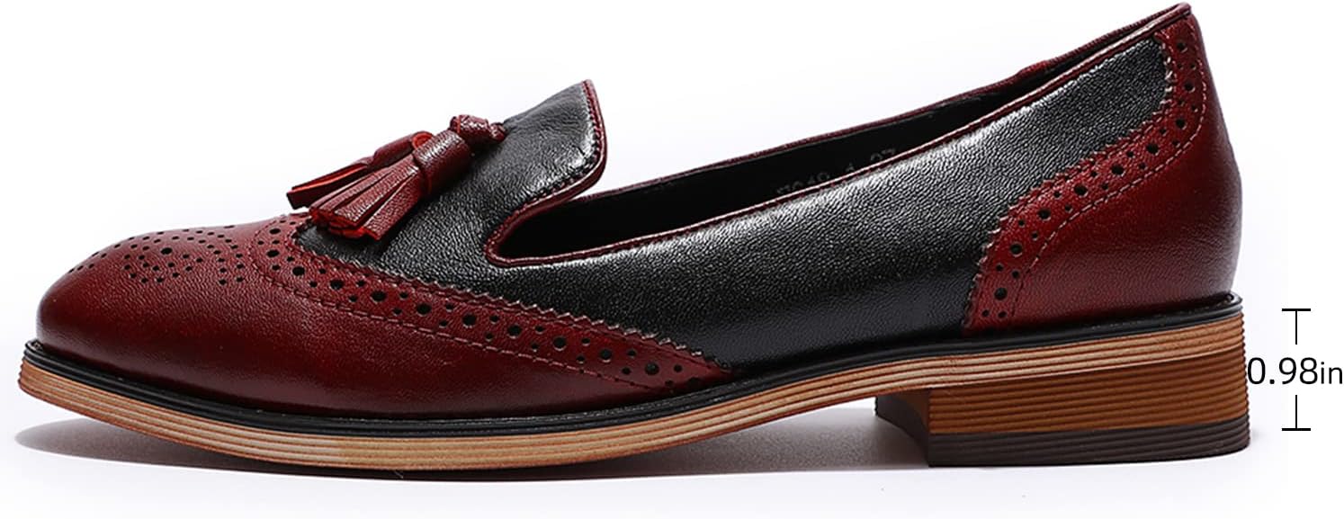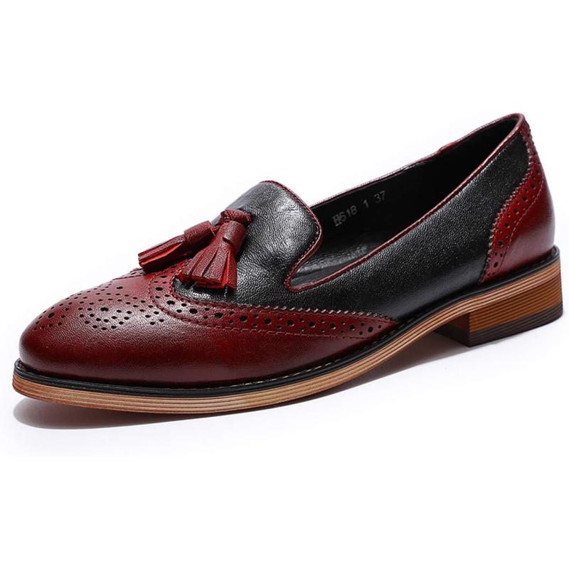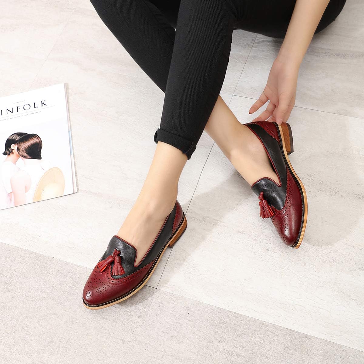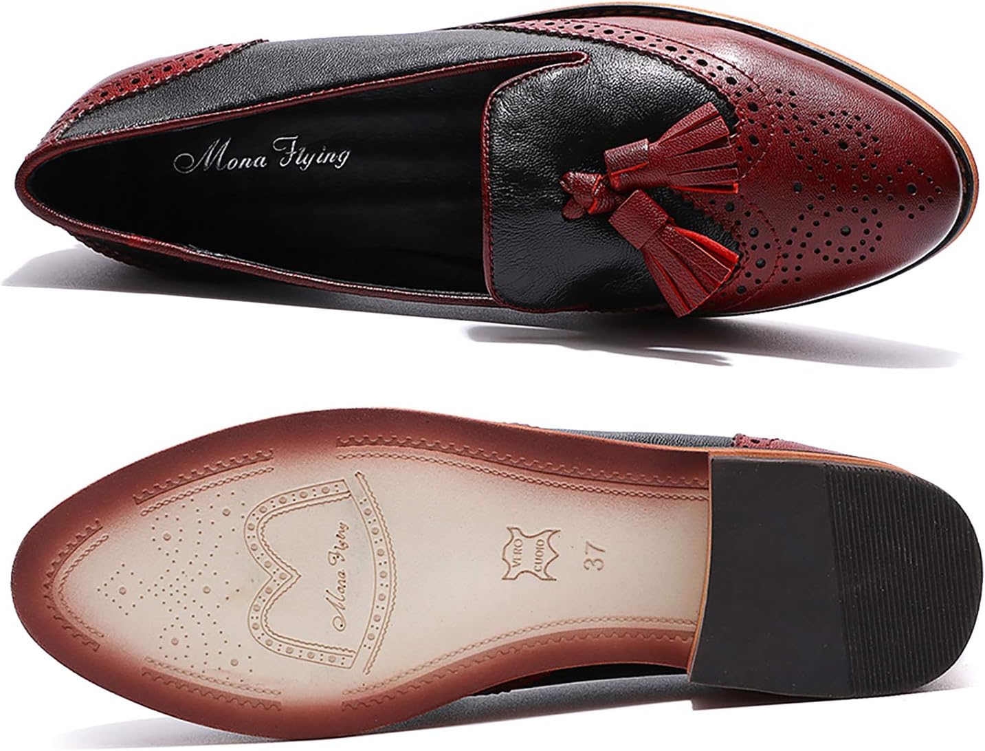 Mona flying Women’s Leather Penny Loafers Slip On Flats Office Ladies Casual Shoes(Dark Red-black)