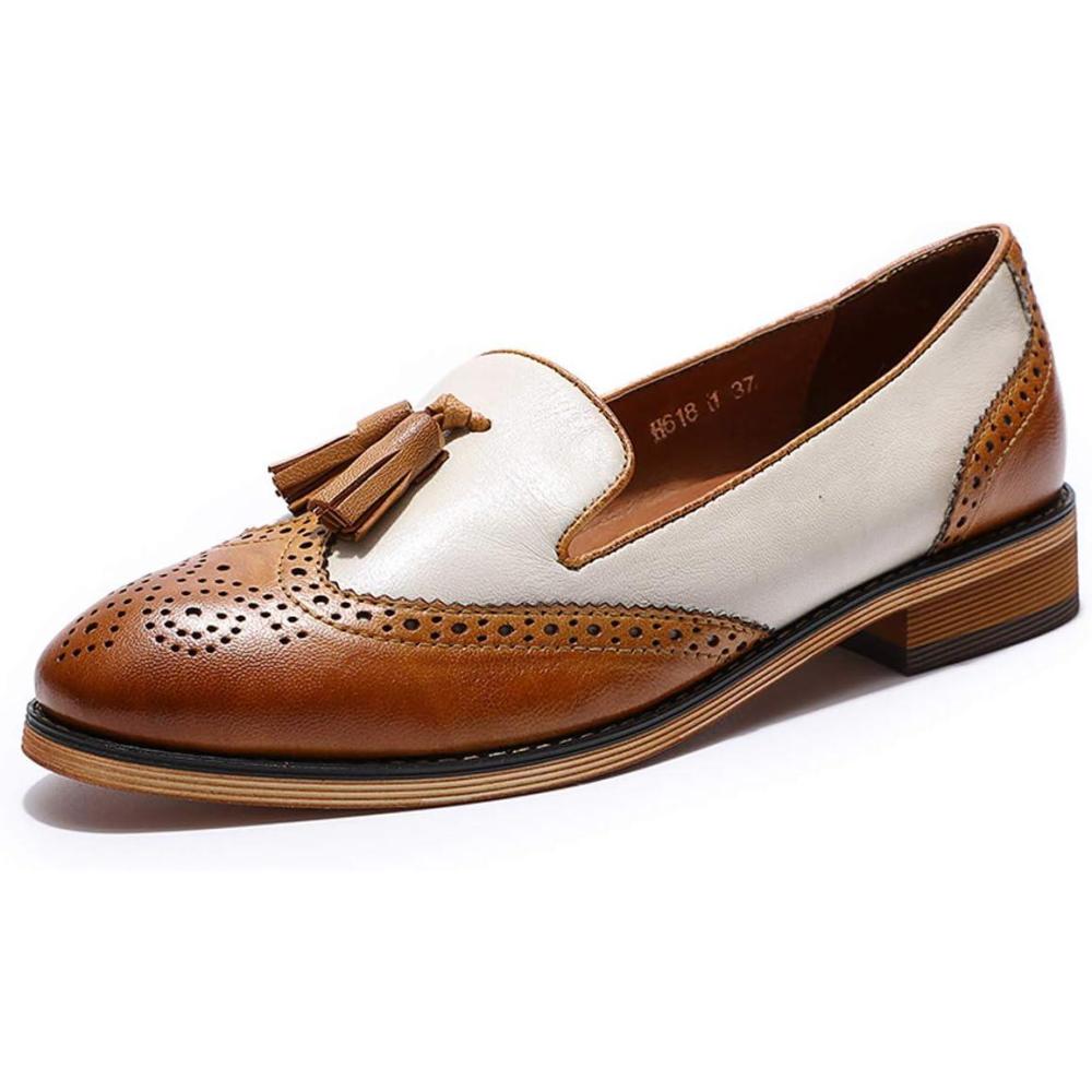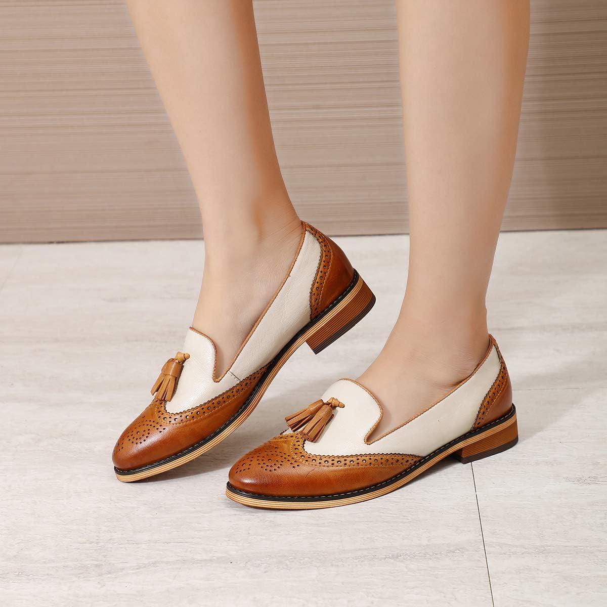 Mona flying Women’s Leather Tassel Loafer Slip on Wingtip Brogue Dress Casual Flat Office Work Shoes for Ladies(Brown-offwhite)