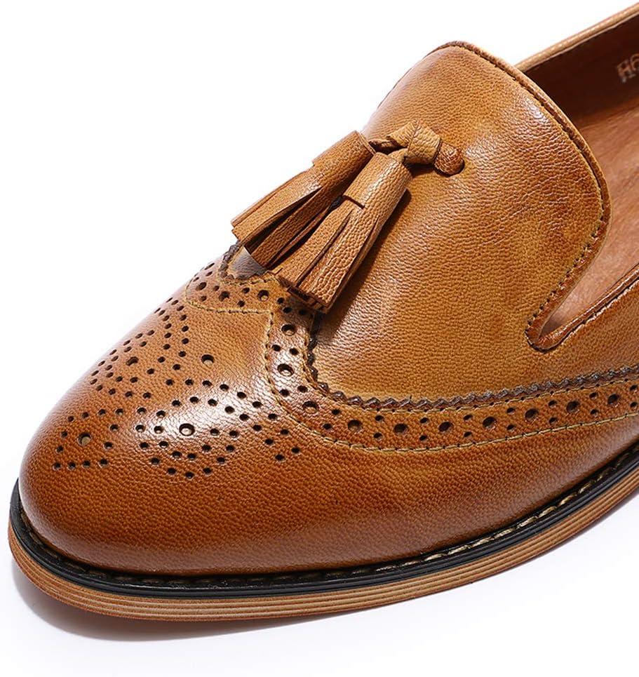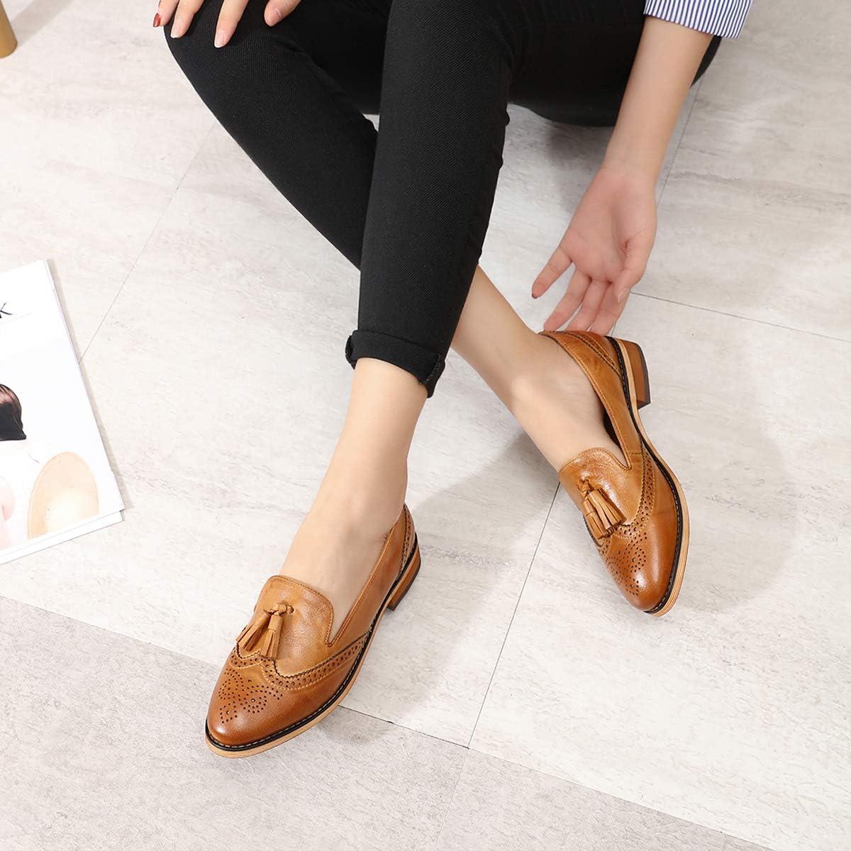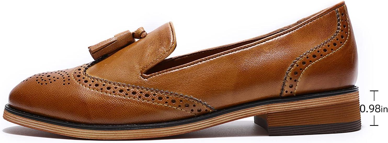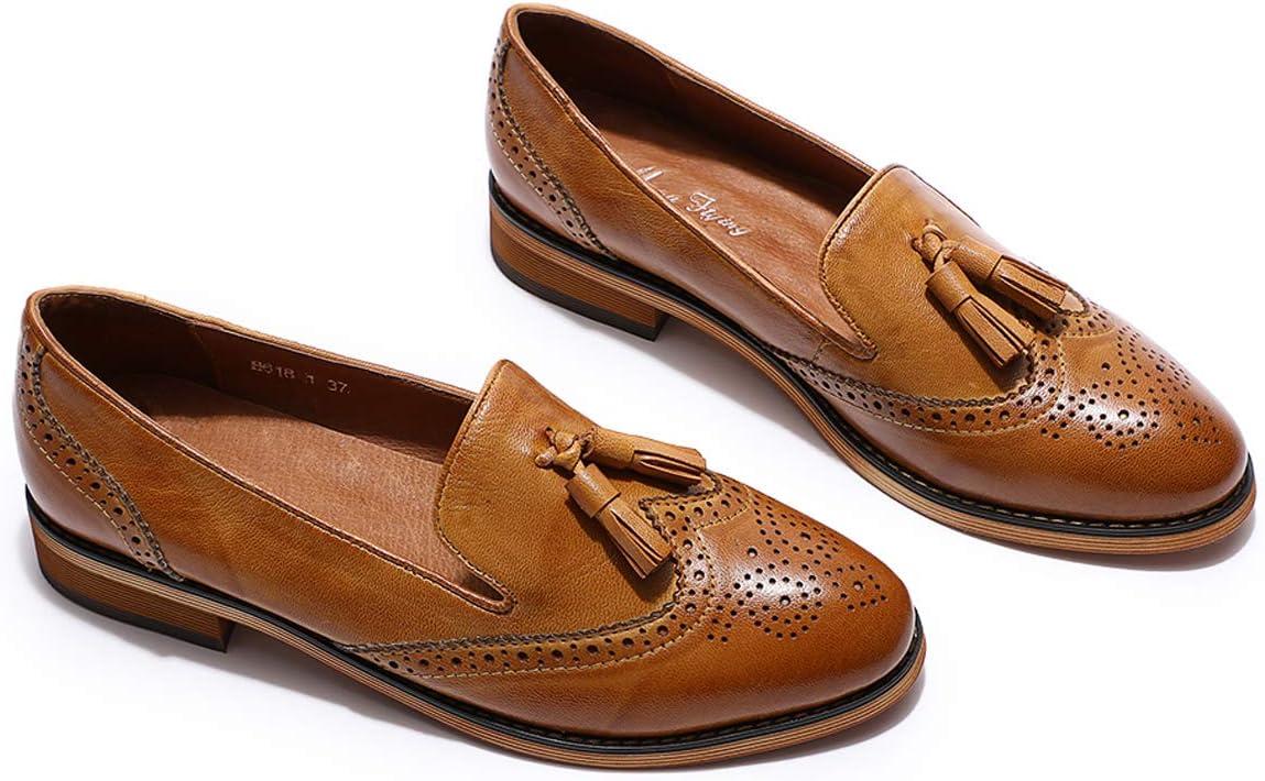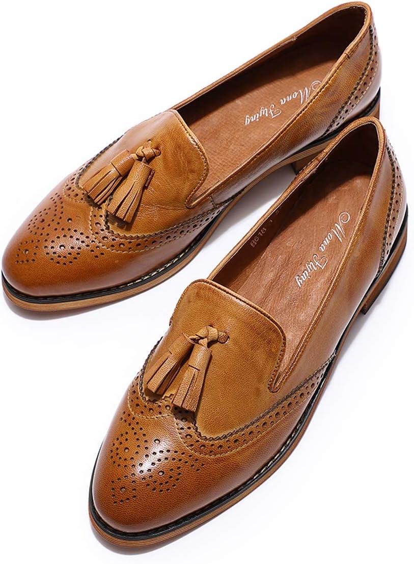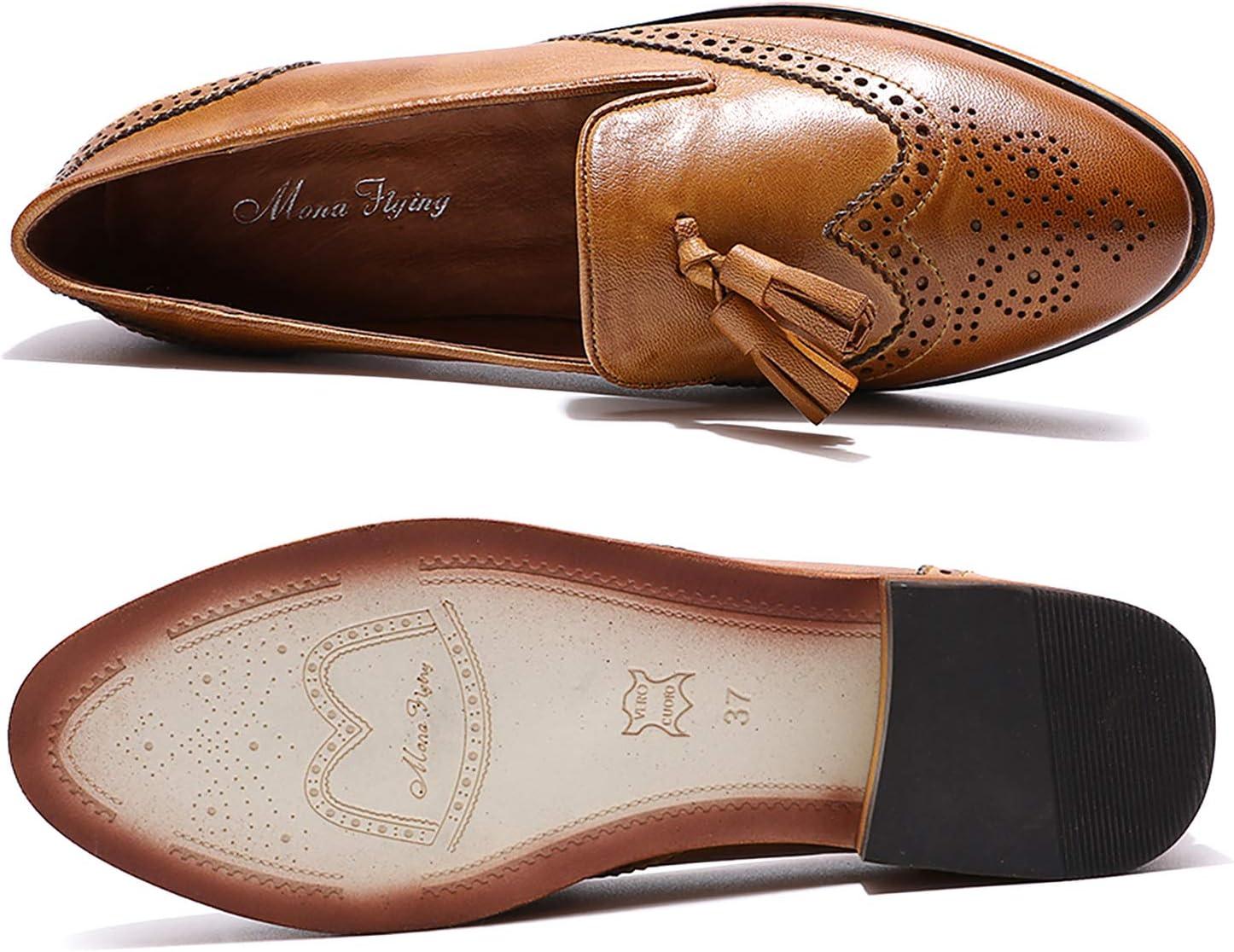 Mona flying Women’s Leather Tassel Loafer Slip on Wingtip Brogue Dress Casual Flat Office Work Shoes for Ladies(Brown)