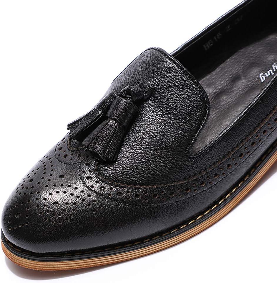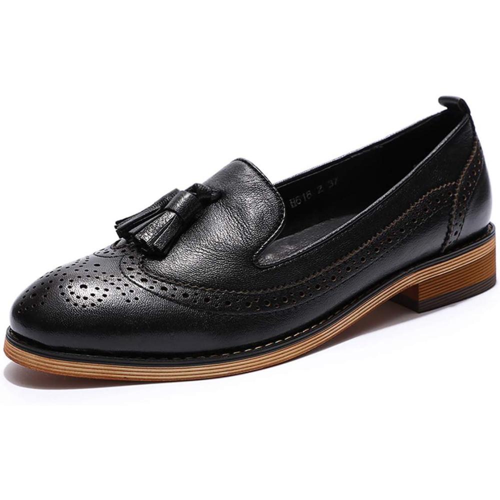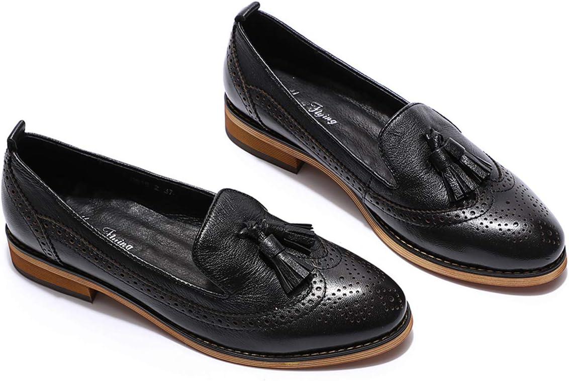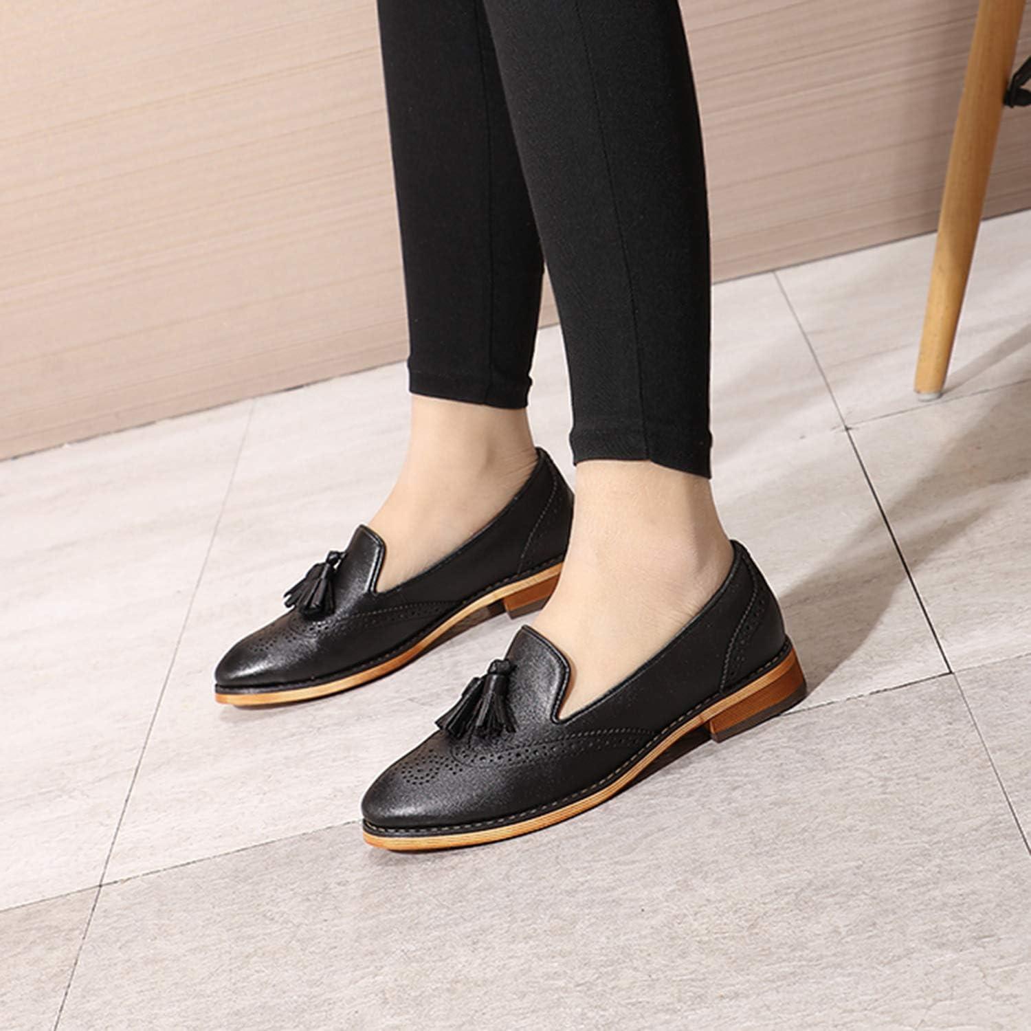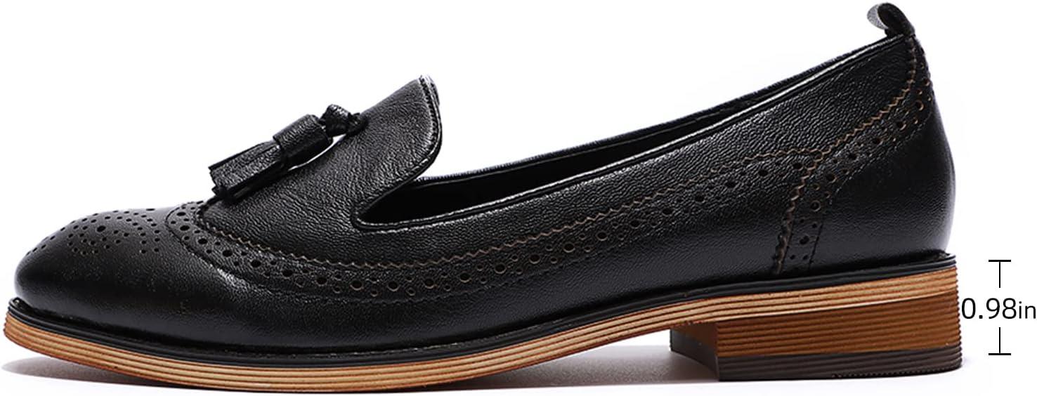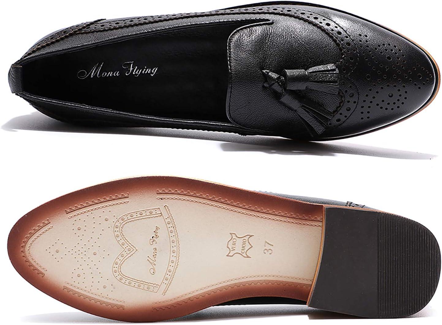 Mona flying Women’s Leather Tassel Loafer Slip on Wingtip Brogue Dress Casual Flat Office Work Shoes for Ladies(Pure Black)