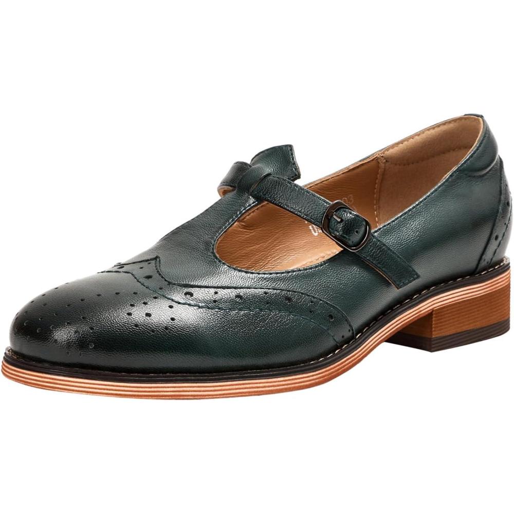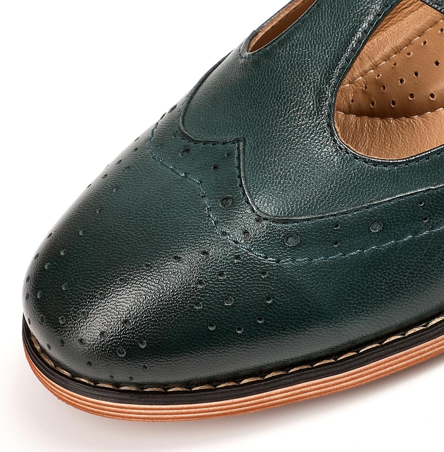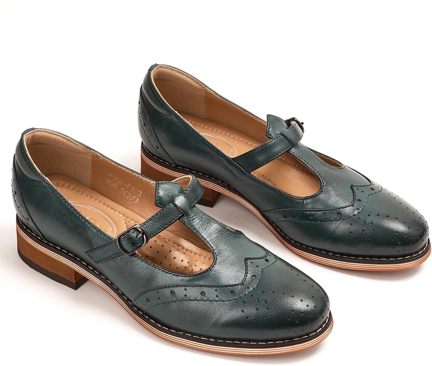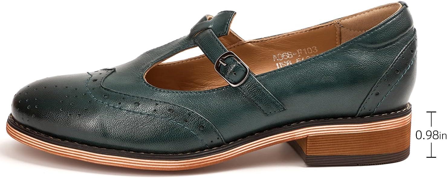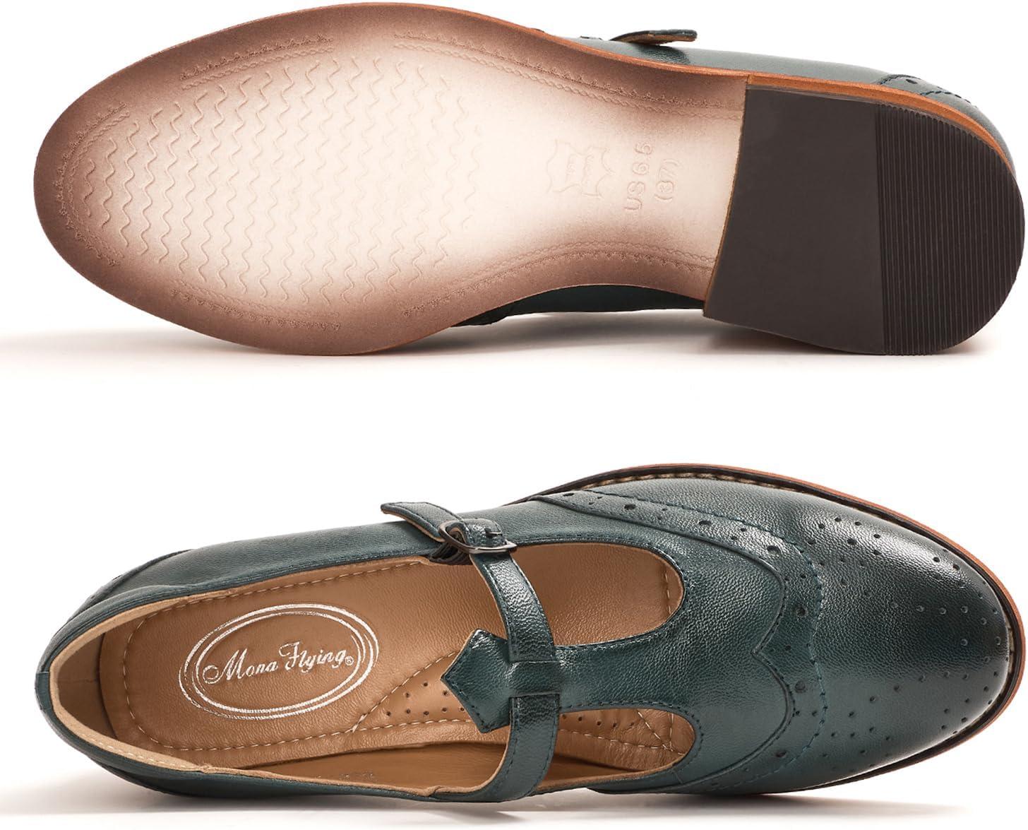 Mona flying Women’s Leather Wingtip Oxford Mary Jane Loafer Casual Flat T Strap Shoes for Ladies(Greenish)