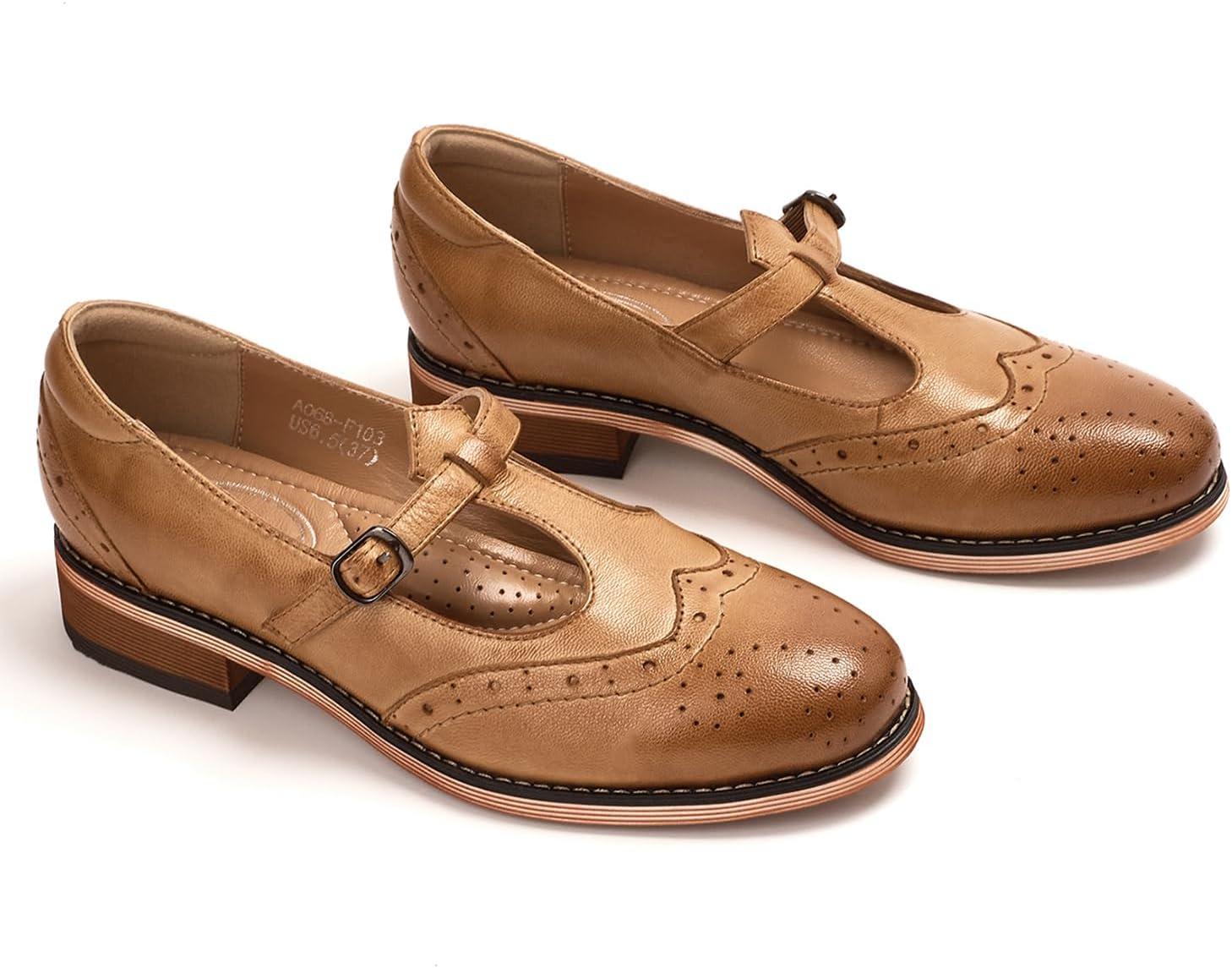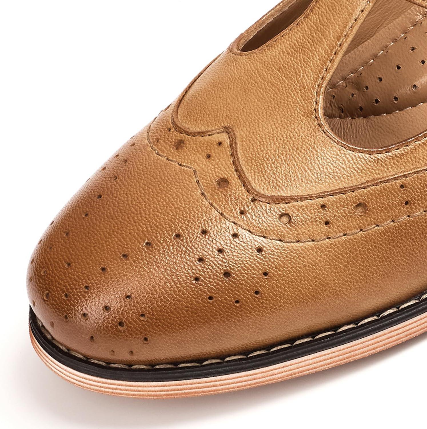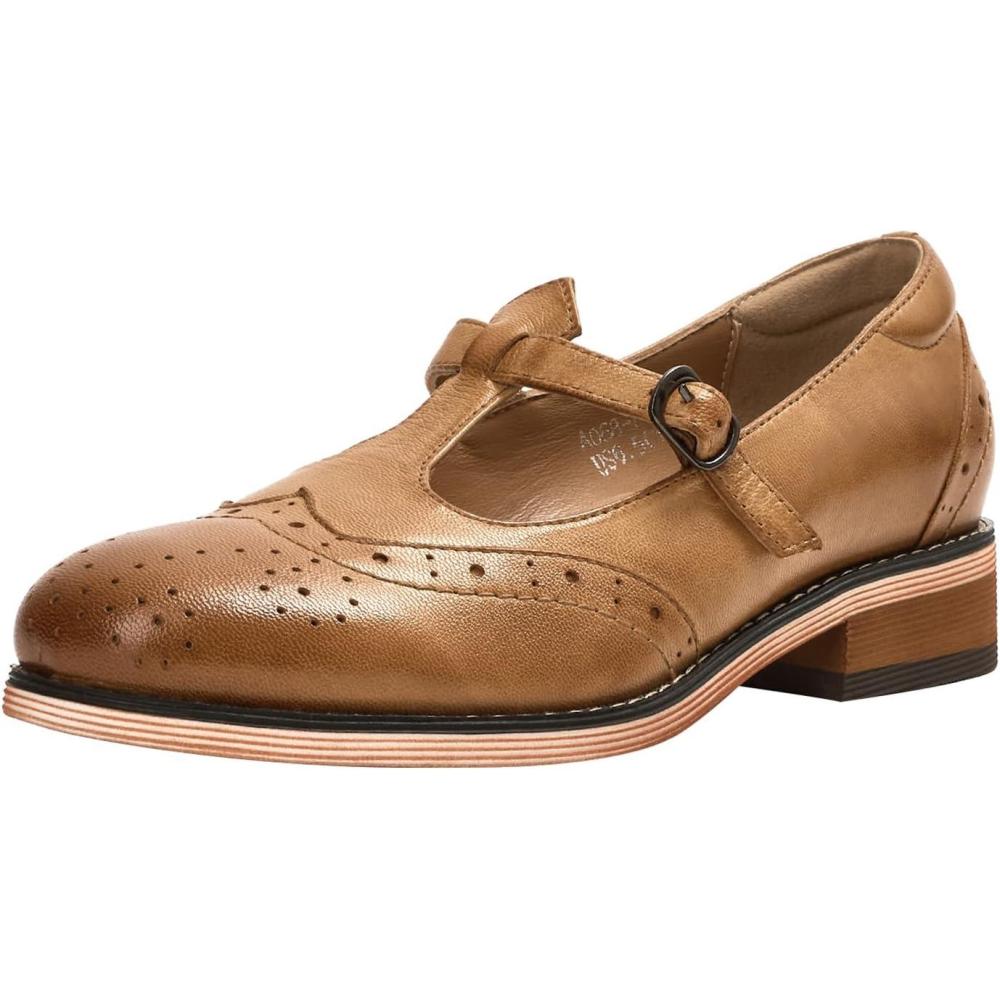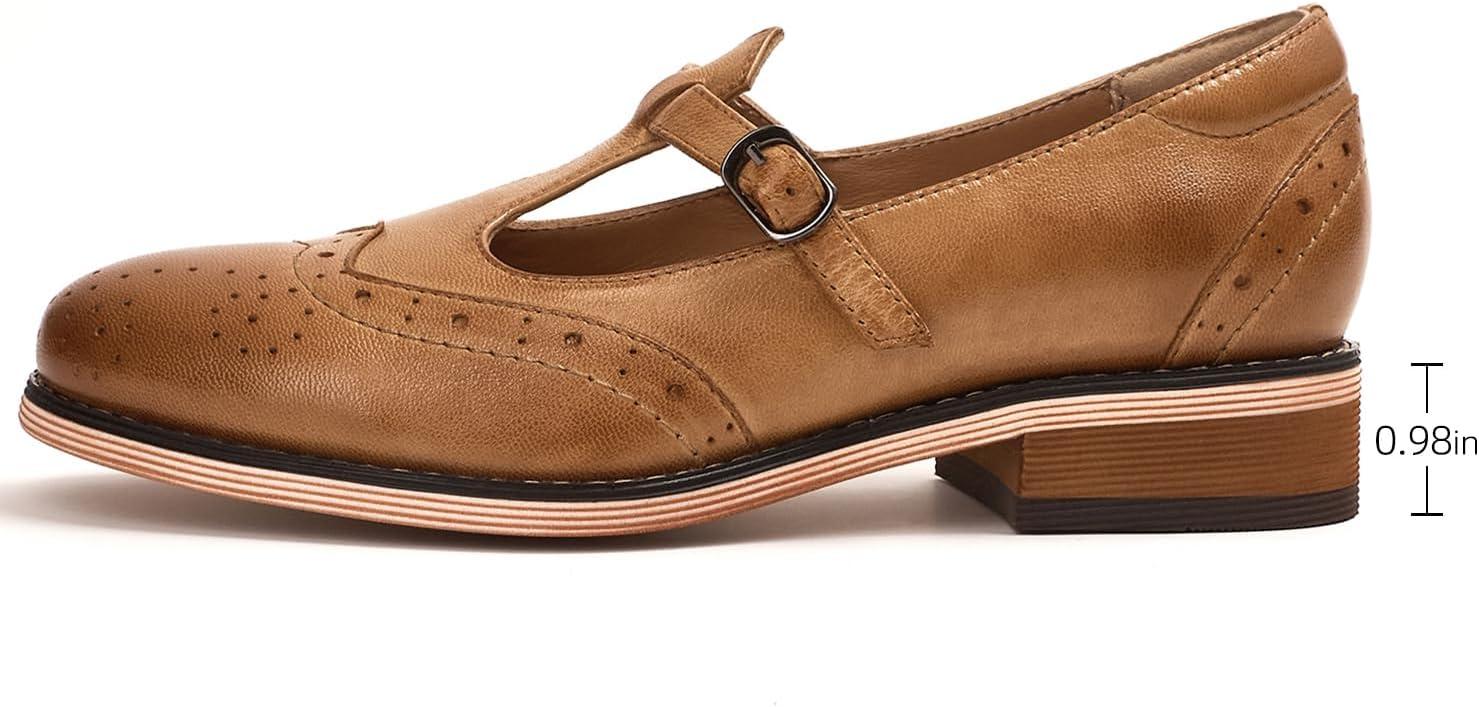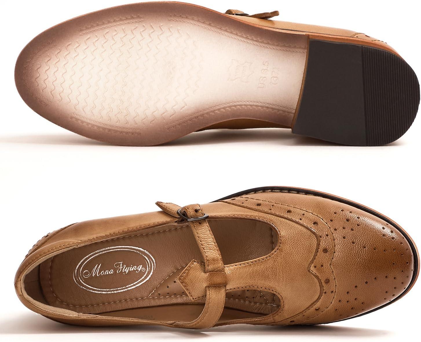 Mona flying Women’s Leather Wingtip Oxford Mary Jane Loafer Casual Flat T Strap Shoes for Ladies(Light Brown)
