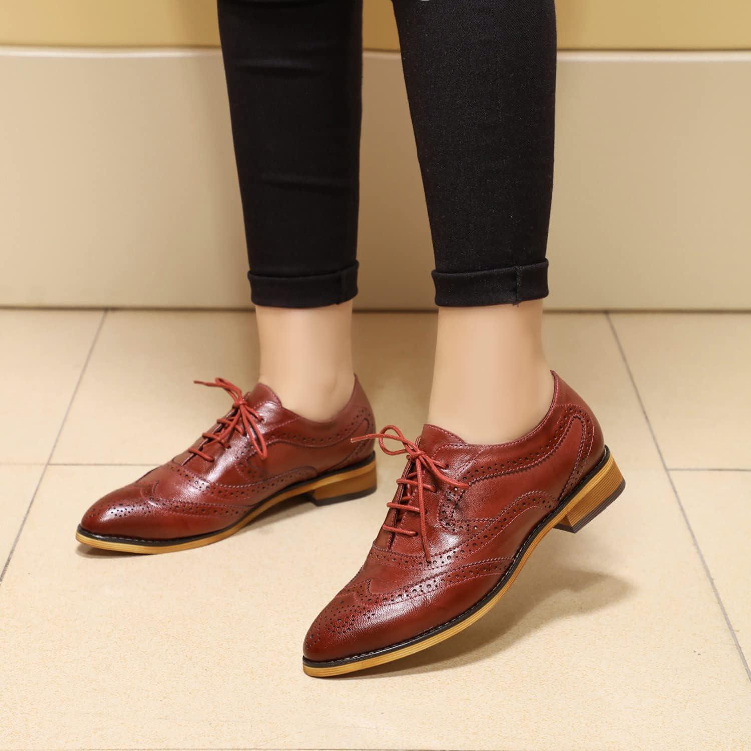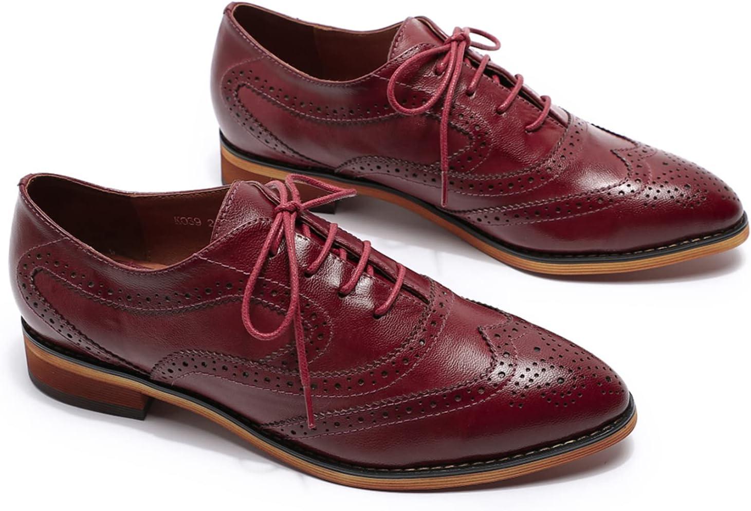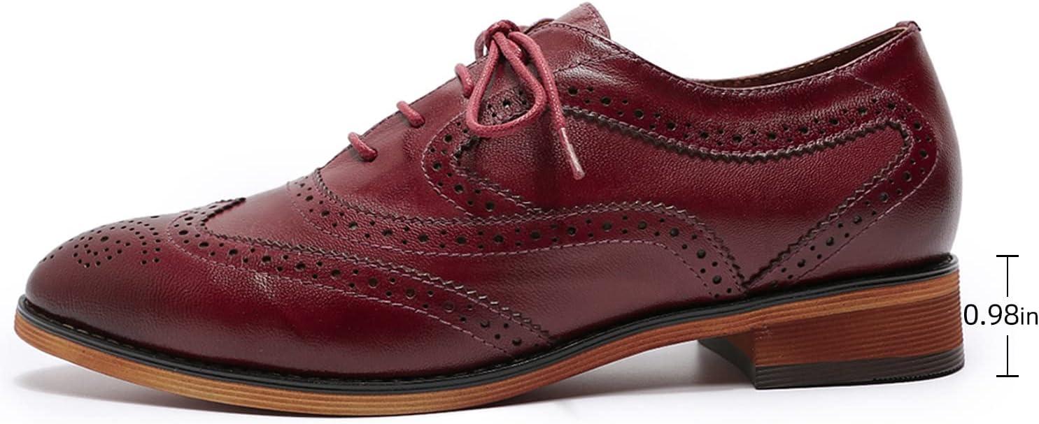 Mona flying Women’s Perforated Oxfords Wingtip Brogue Lace up Leather Flat Office Work Shoes for Ladies(Wine Red)